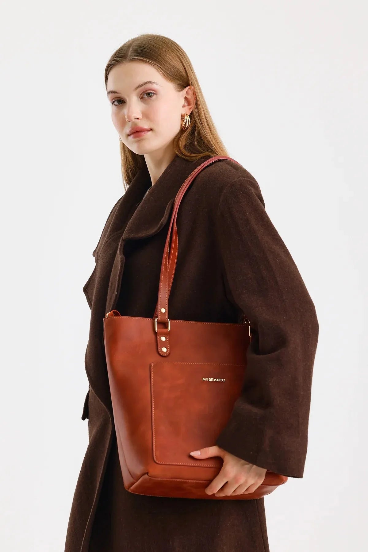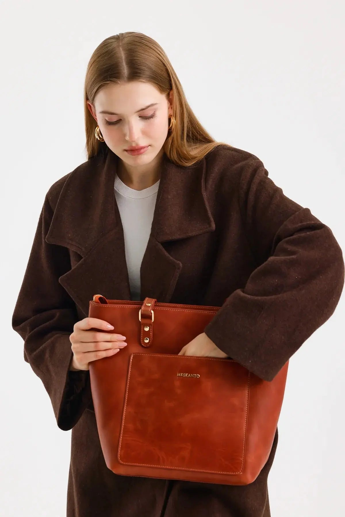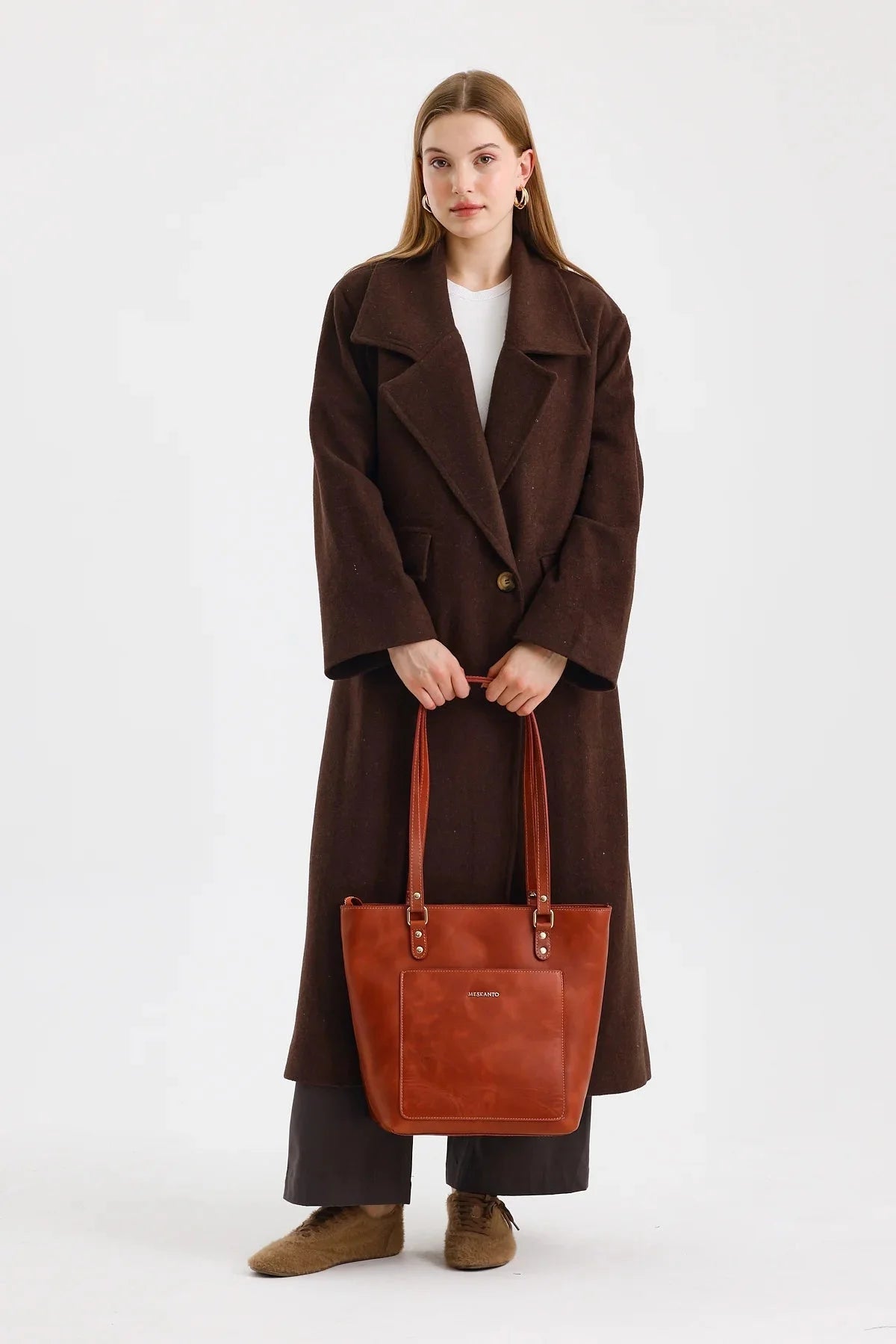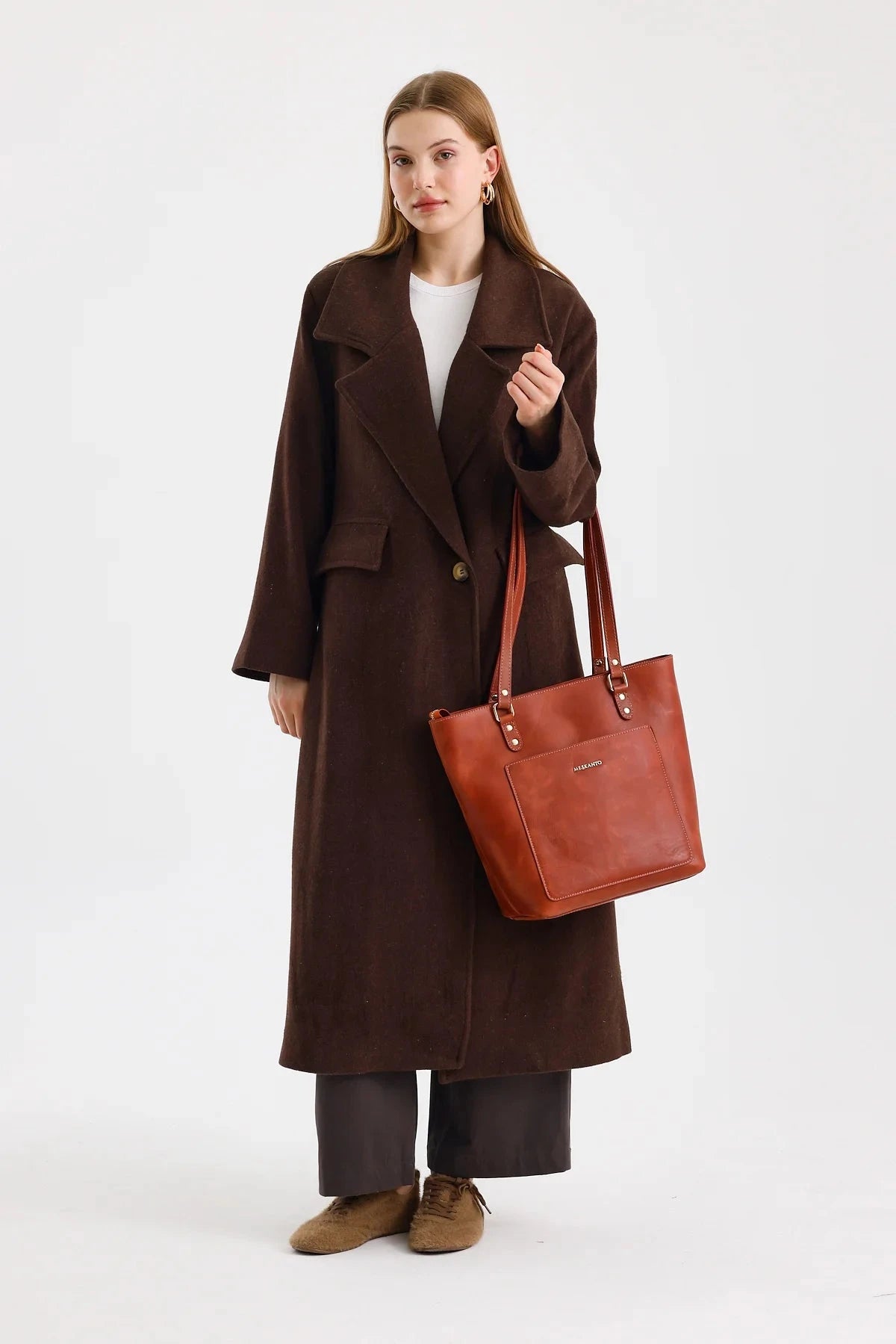 Tote, hakiki deriden üretilmiş olup A4 evrak ve tabletlerinizi rahatça taşır. Ön cebi ve metal fermuarıyla eşyalarınızı güvenle saklamanızı sağlar.