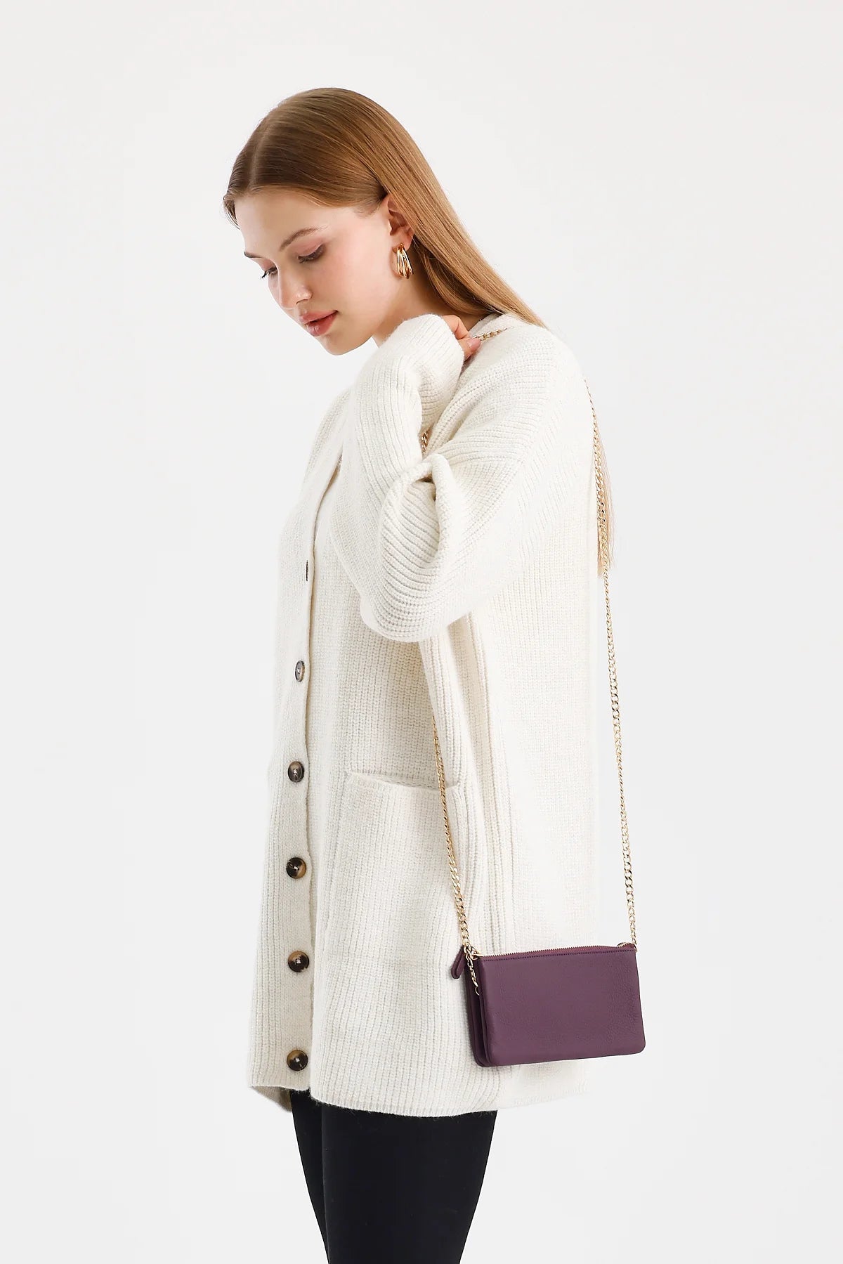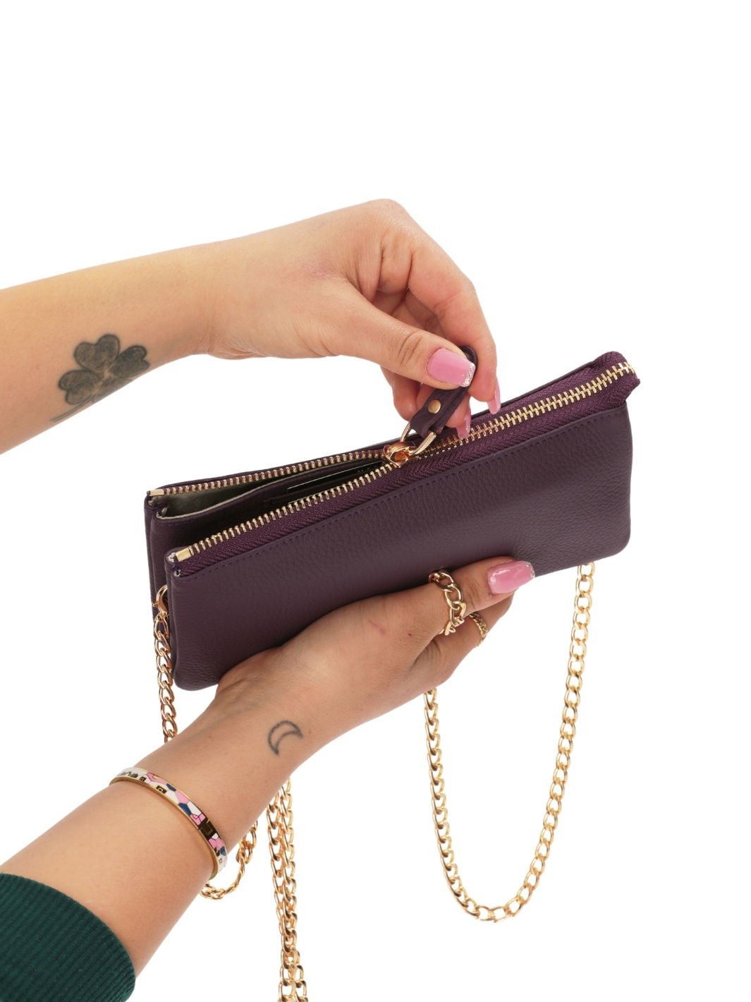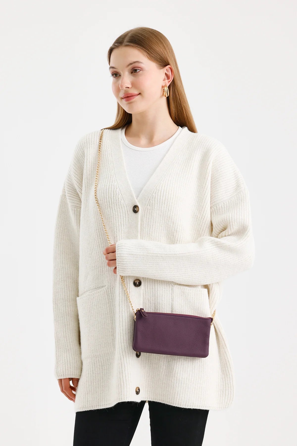 Emily, 11 cm genişlik ve 20 cm yükseklik ölçüleriyle kompakt yapıdadır. İçerisinde 2 fermuarlı bölme bulunan tasarım, tüm ihtiyaçlarınızı karşılar. Pratik zincirli askısı sayesinde güvenli taşıma imkanı sunar.