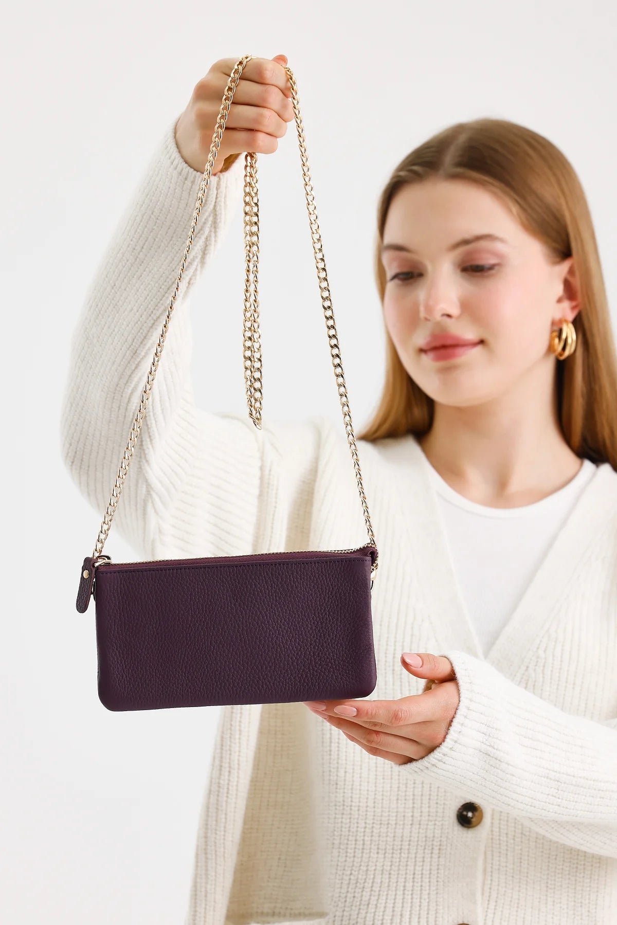 Emily Hakiki Deri İki Bölmeli Zincirli Mini Kadın Çanta