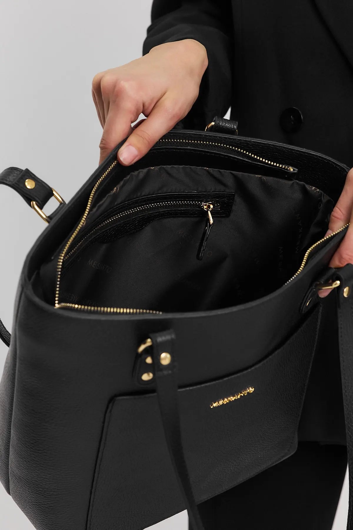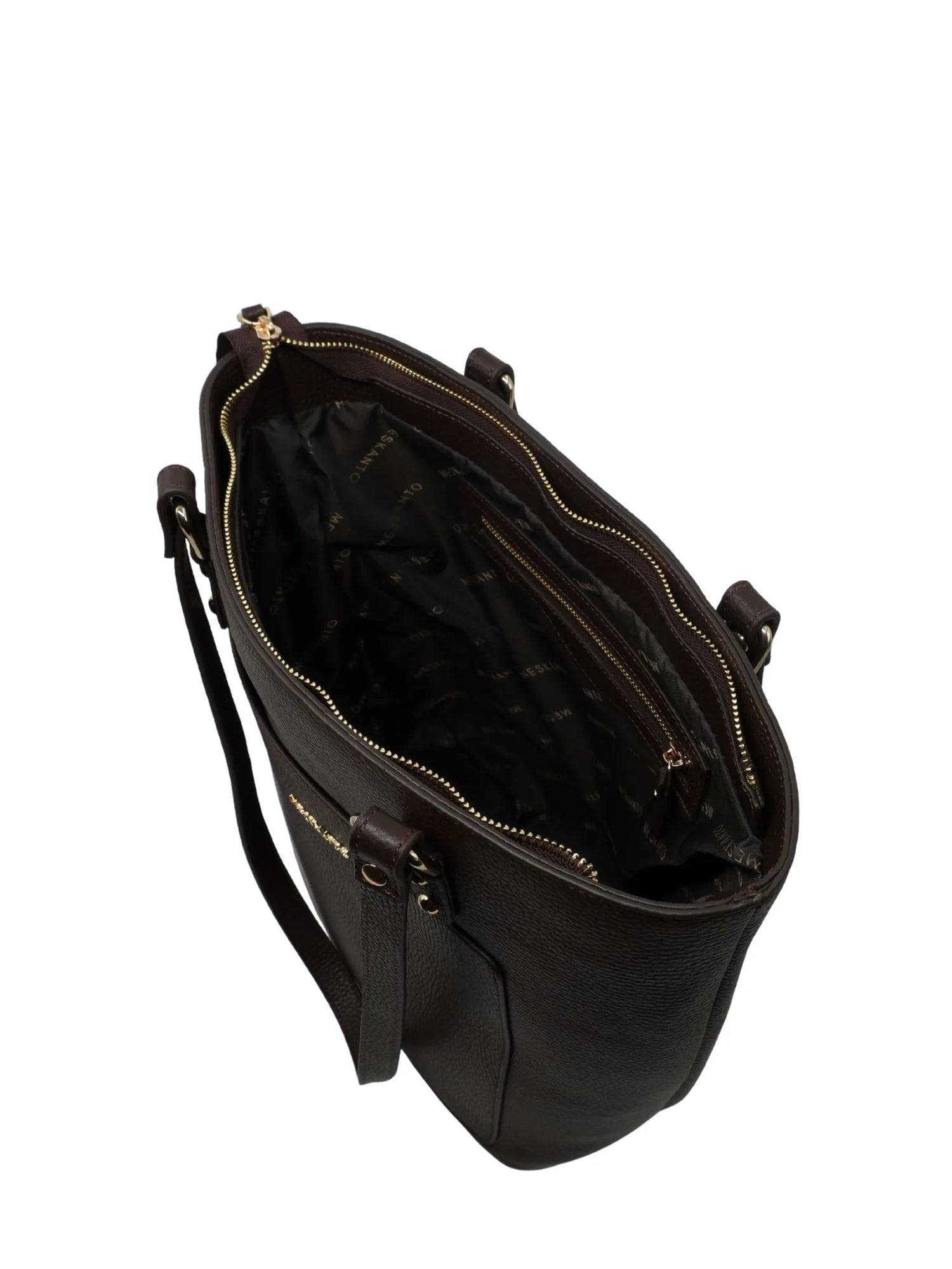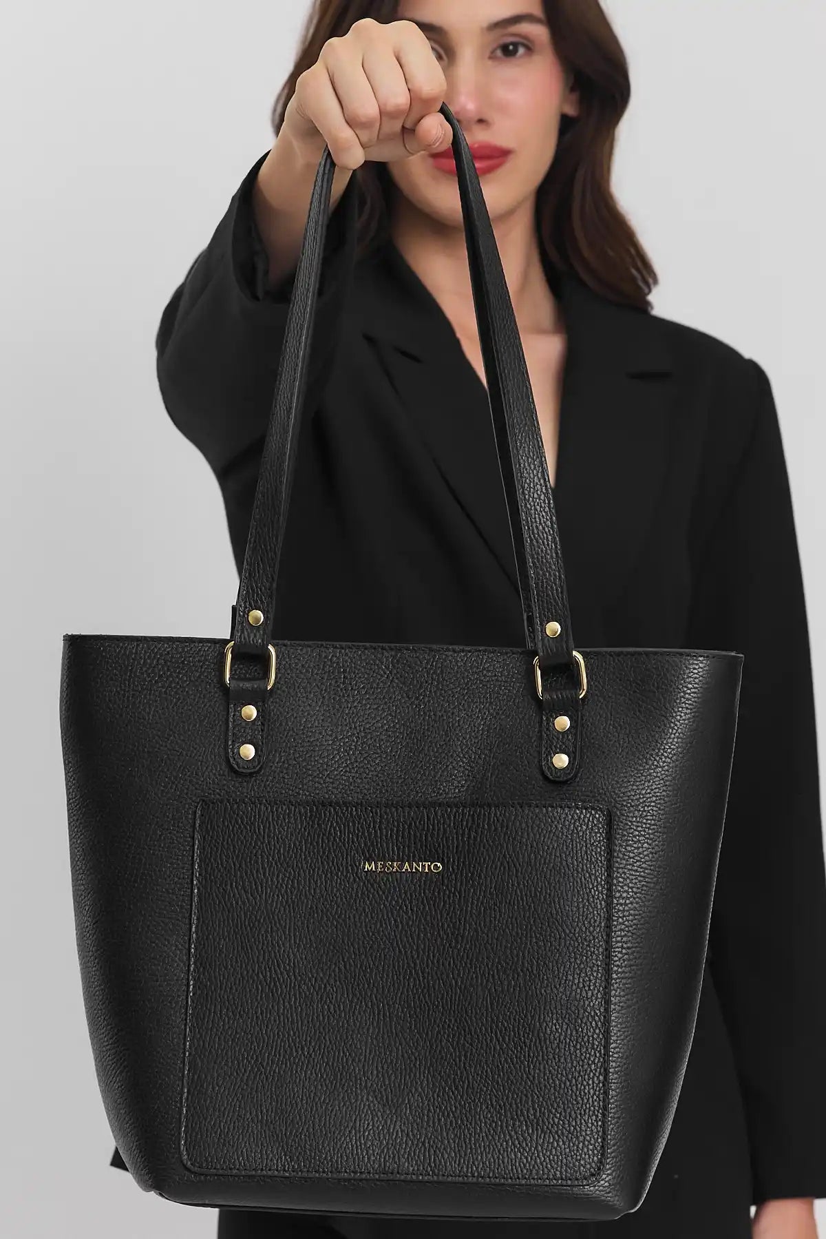 Tote, hakiki deriden üretilmiş olup A4 evrak ve tabletlerinizi rahatça taşır. Ön cebi ve metal fermuarıyla eşyalarınızı güvenle saklamanızı sağlar.