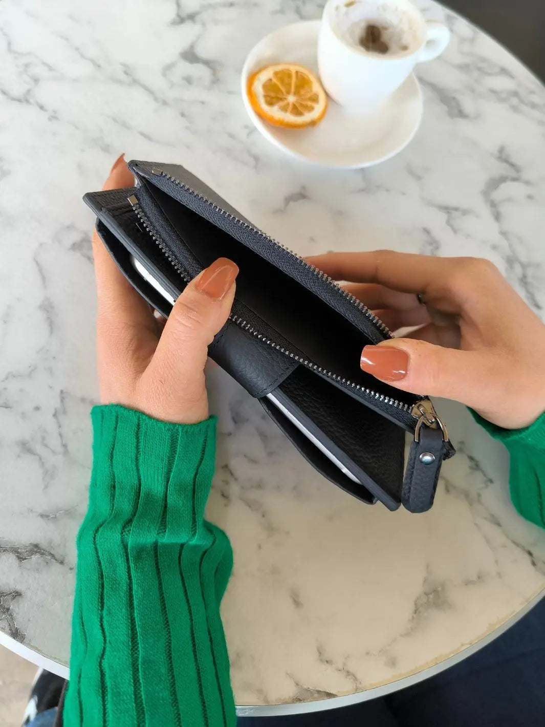 Olivia, fermuarlı bölmesi, telefon gözü ve 12 kart bölmesiyle kredi kartlarınızı, banka kartlarınızı ve kimliklerinizi düzenli bir şekilde saklamanızı sağlar. Fermuarlı bozuk para bölmesi, madeni paralarınızı güvenle muhafaza ederken, özel telefon bölmesi cihazınızı koruyarak rahat taşıma imkanı sunar.