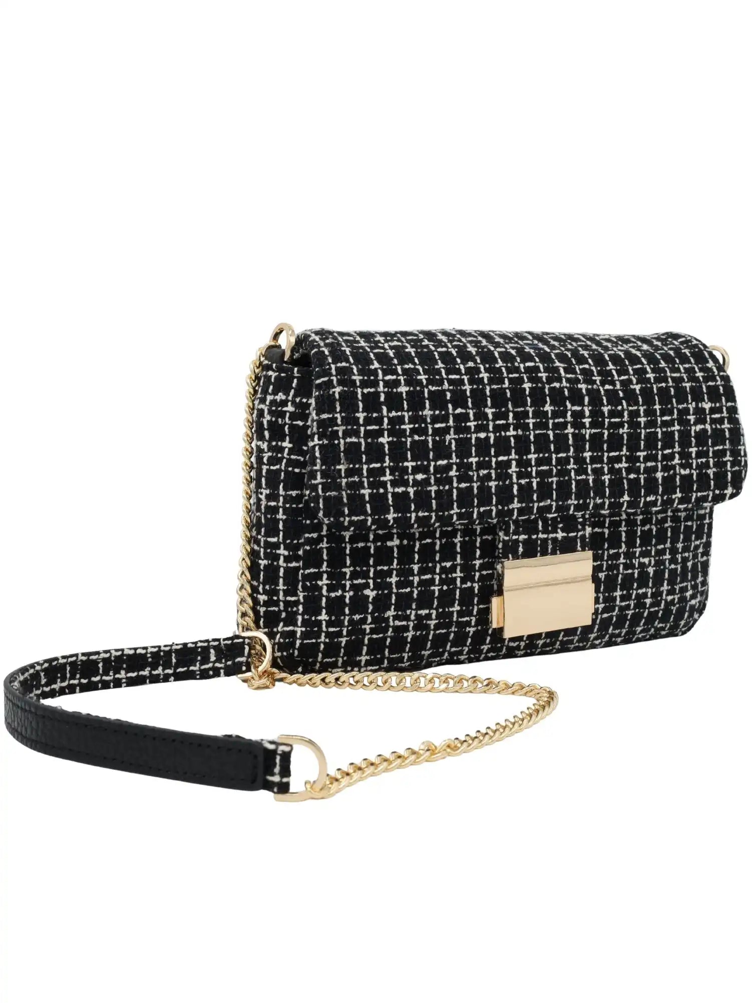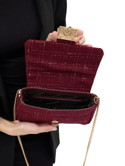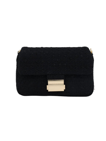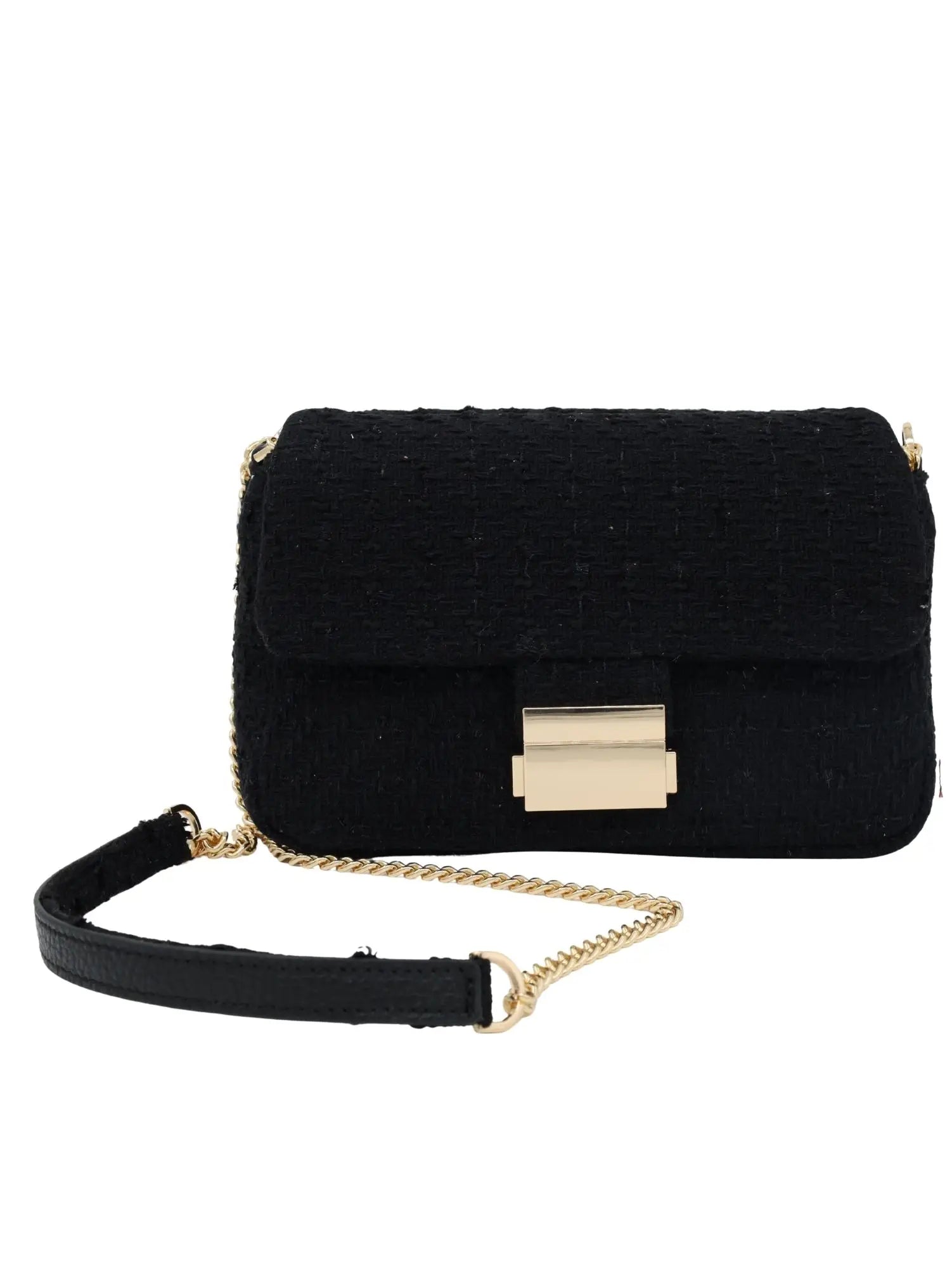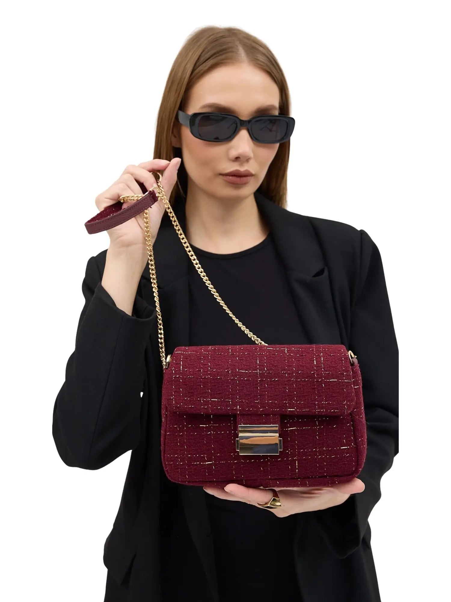 Zarif tasarımı ve işlevselliğiyle öne çıkan bu tüvit kumaş omuz çantası, her stile uyum sağlayan şık bir aksesuar seçeneğidir. Gold zincir askısı ve modern mıknatıslı kapama detayıyla hem estetik hem de pratik bir kullanım sunar. İç kısmında yer alan küçük bölmesi, anahtar, kart veya makyaj malzemesi gibi eşyalarınızı düzenli bir şekilde taşımanızı sağlar. 21 cm genişlik, 15 cm yükseklik ve 5 cm derinlik ölçülerine sahip olan çanta, boyutlarıyla günlük kullanıma uygun bir yapıdadır. Şık detaylarıyla hem gündüz hem de gece kombinlerinizde zarif bir tamamlayıcı olarak öne çıkar.